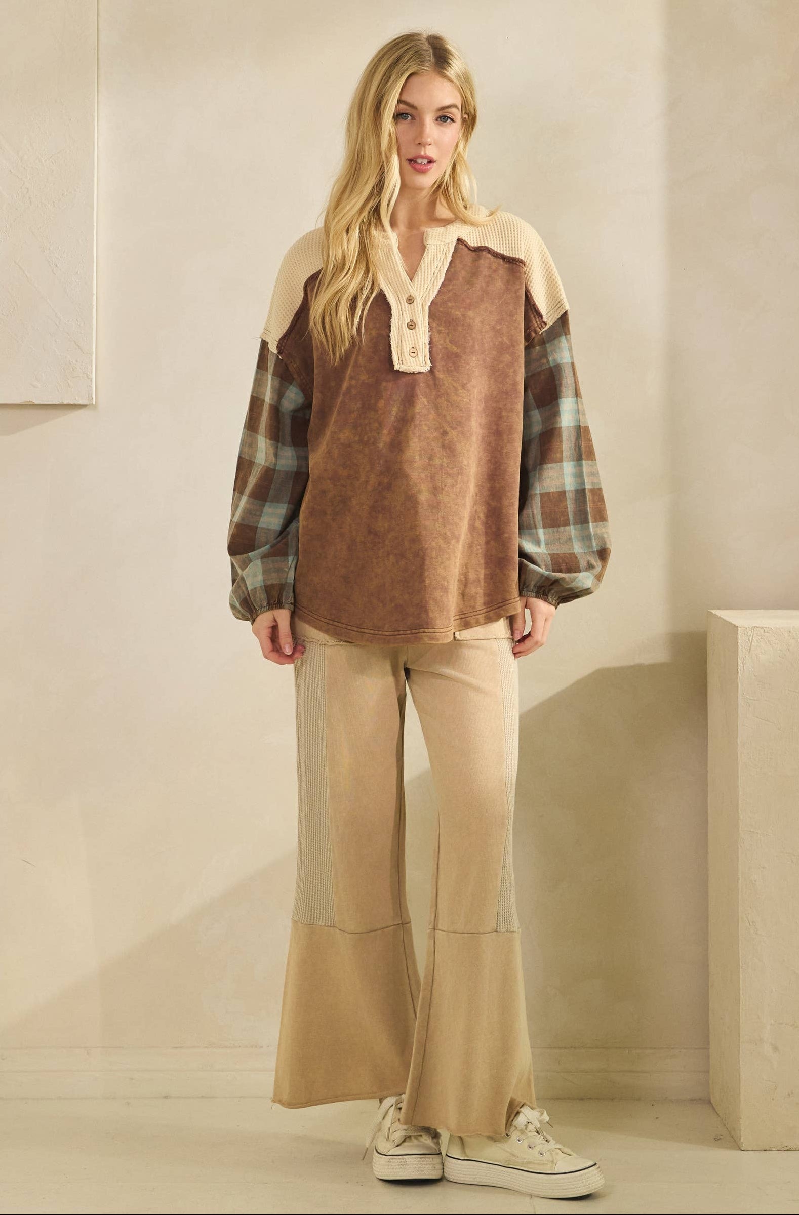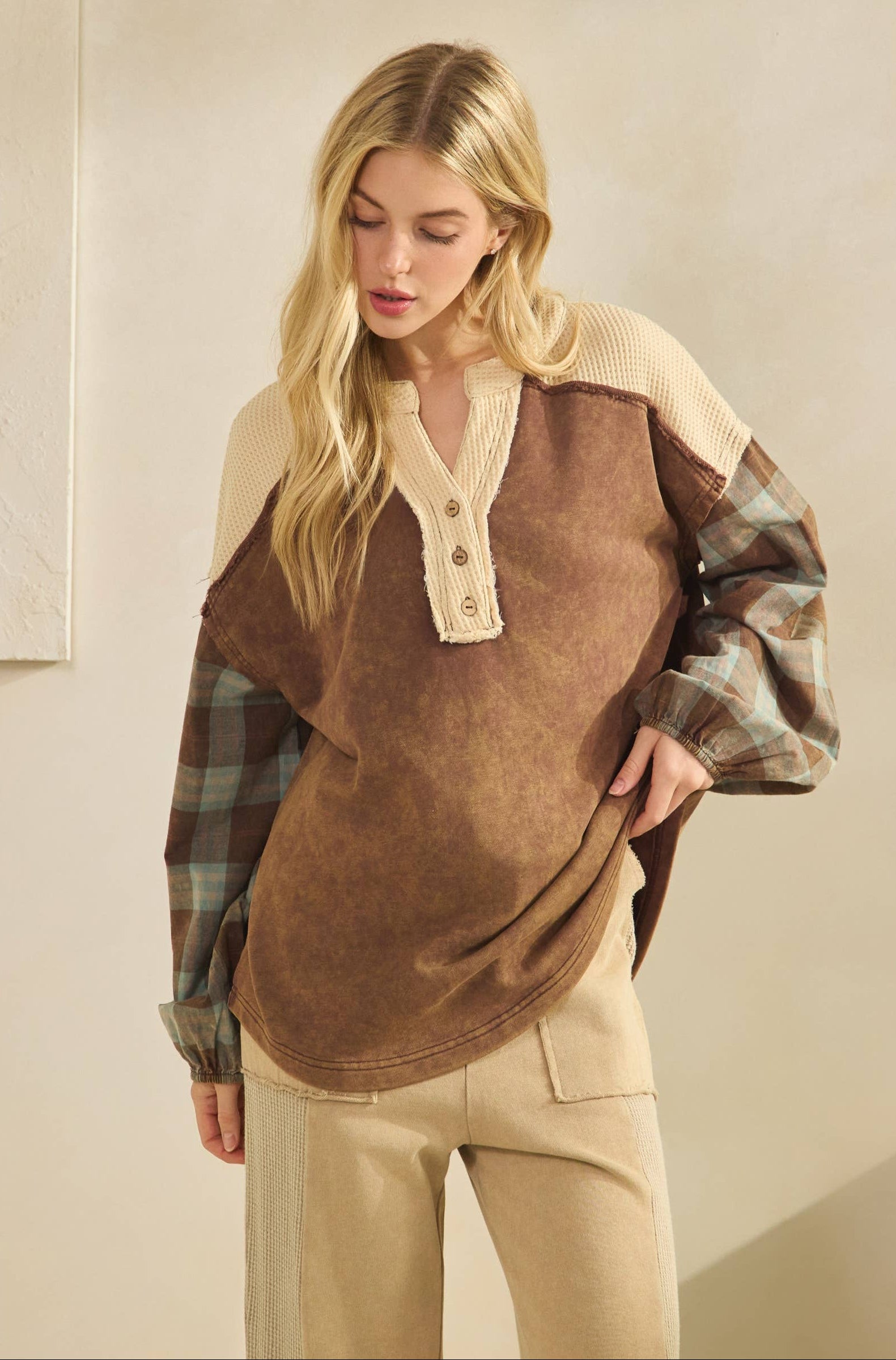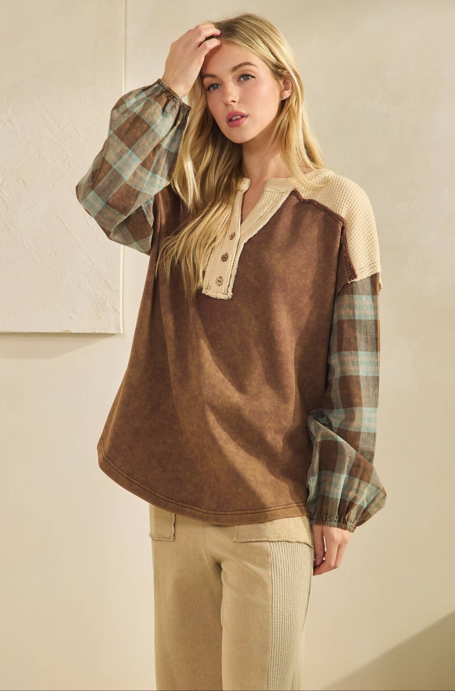 This relaxed henley-style top features a mineral washed, soft thermal knit neckline with button detail, and plaid flannel sleeves in rustic earth tones. With its easy silhouette and rugged-chic appeal.
