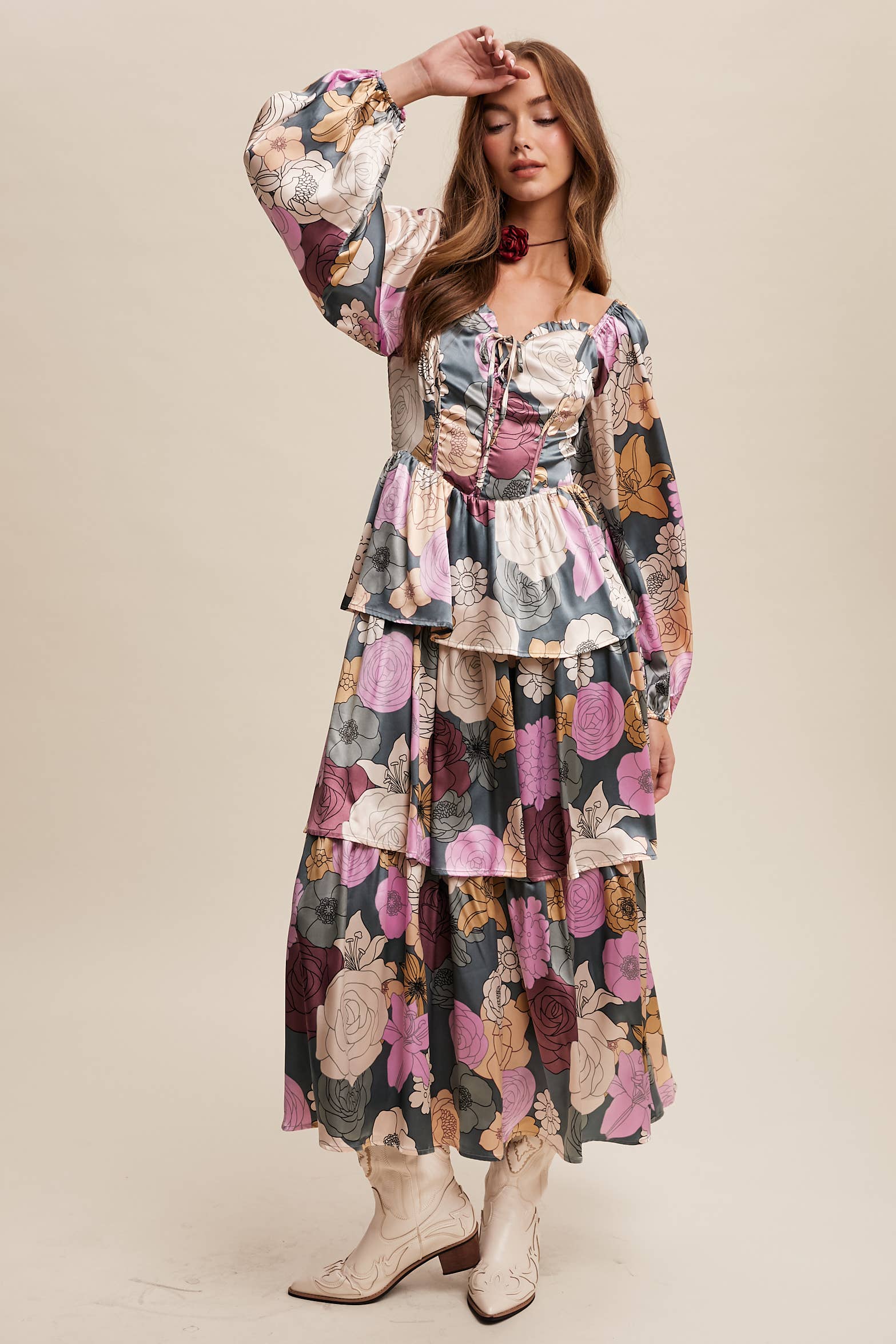 Felicia Floral Lace-Up Tiered Maxi Dress ~ Teal