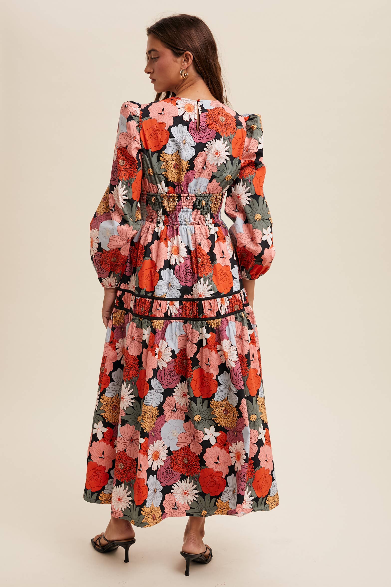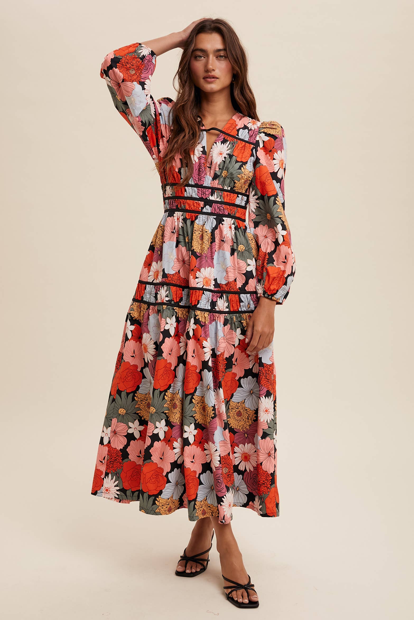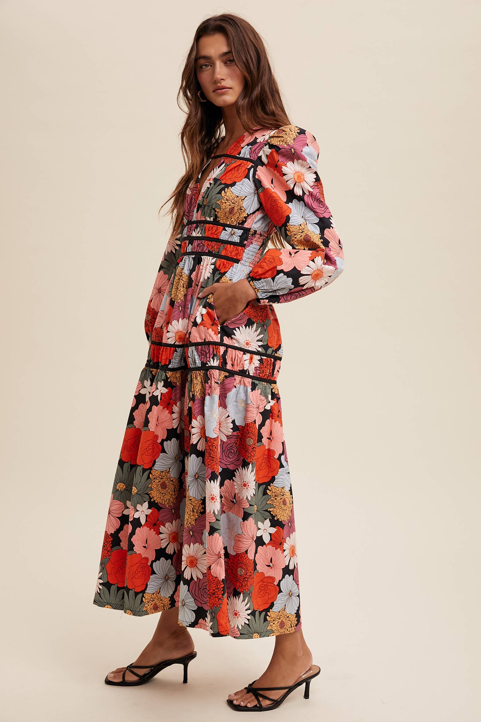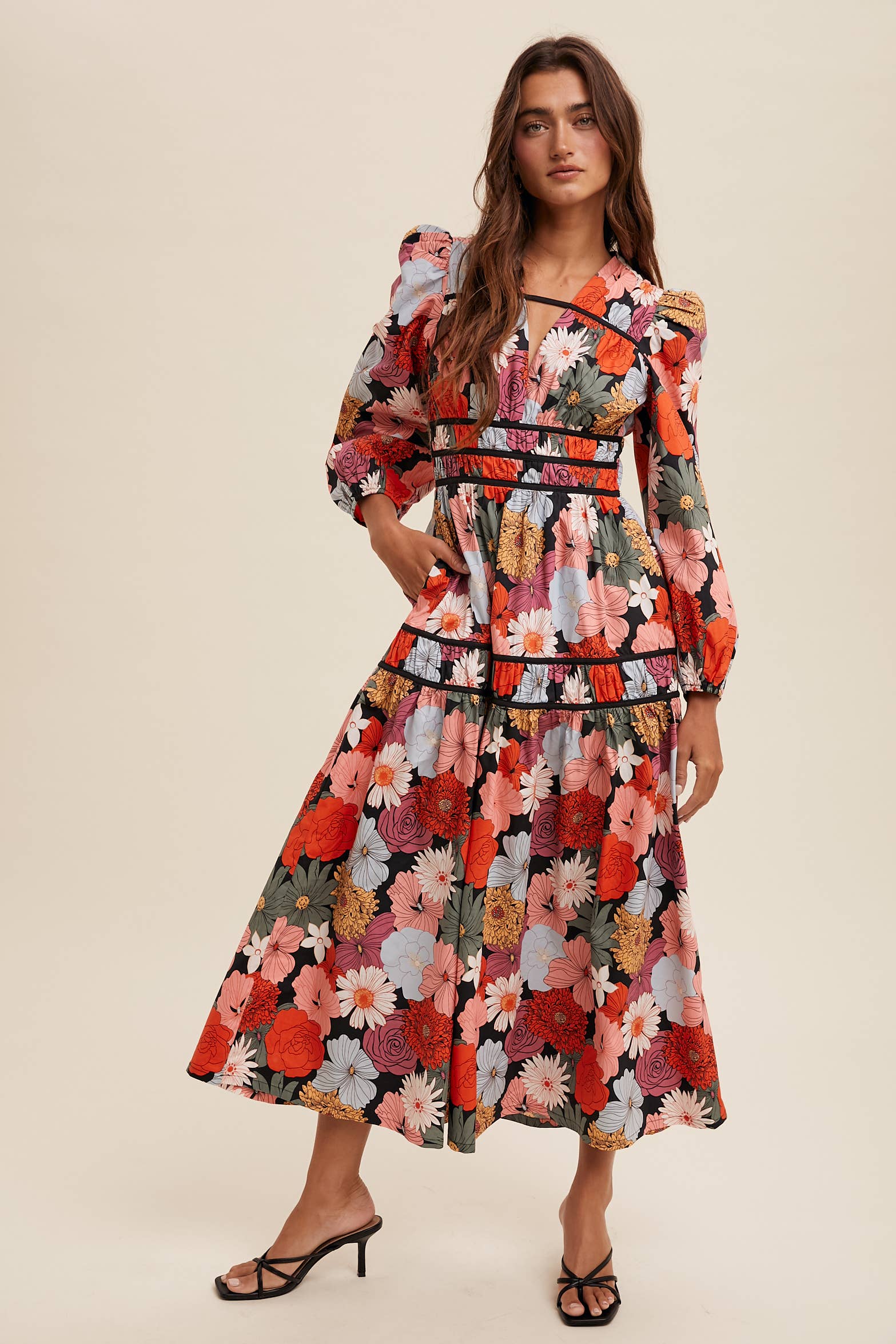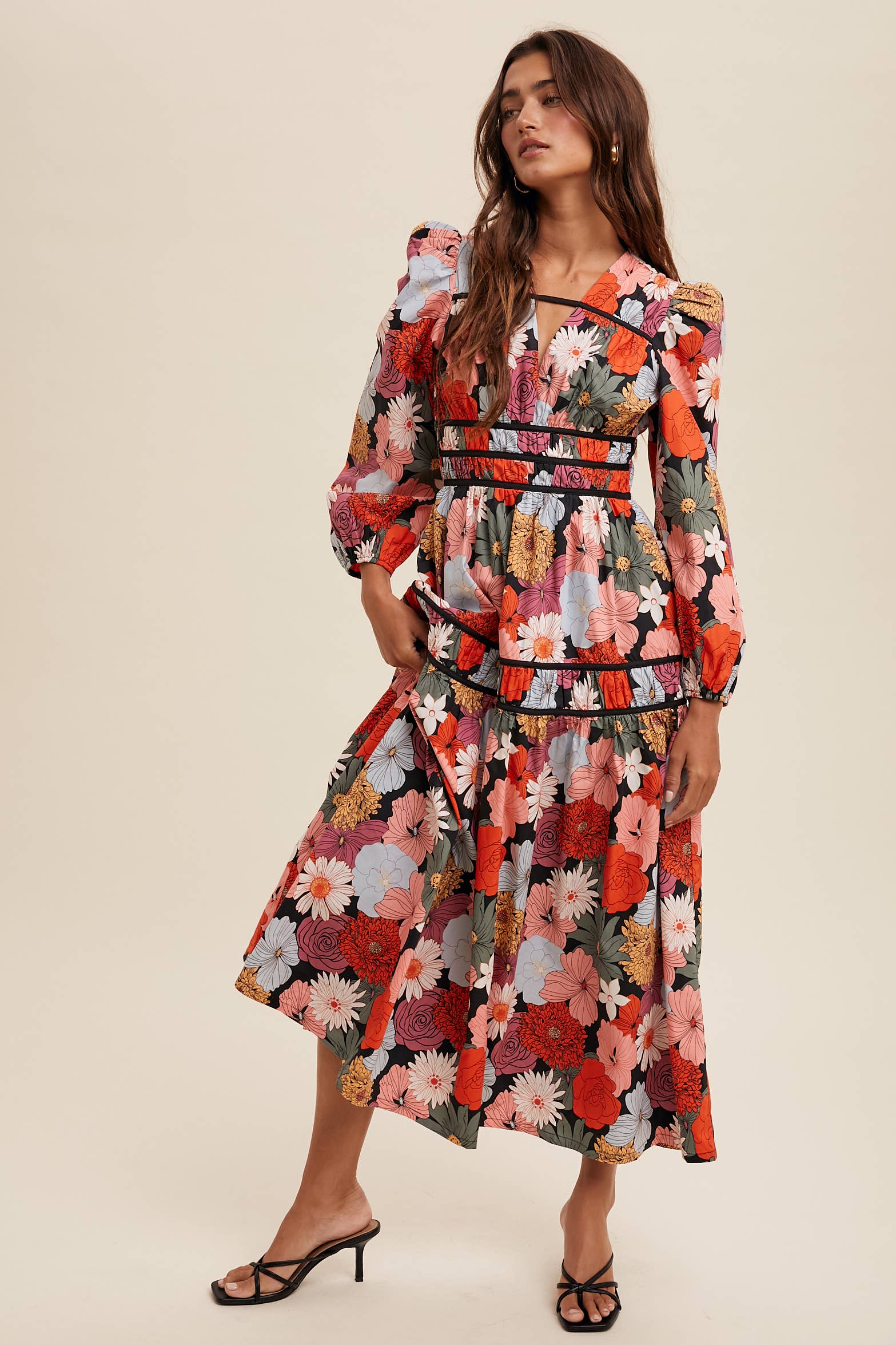 Vibrant and romantic, this floral midi dress is perfect for making a bold statement. Whether styled with heels for formal occasions or boots for a boho Western-inspired look, it blends feminine charm with modern drama.