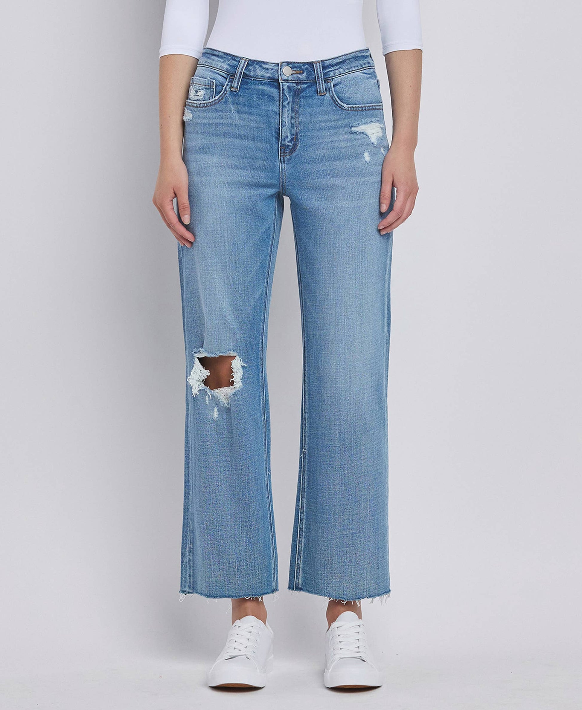 COMFORT STRETCH DENIM, HIGH RISE WAIST, DISTRESSED DETAIL, RAW HEM, CROPPED LENGTH, SLIM WIDE JEANS