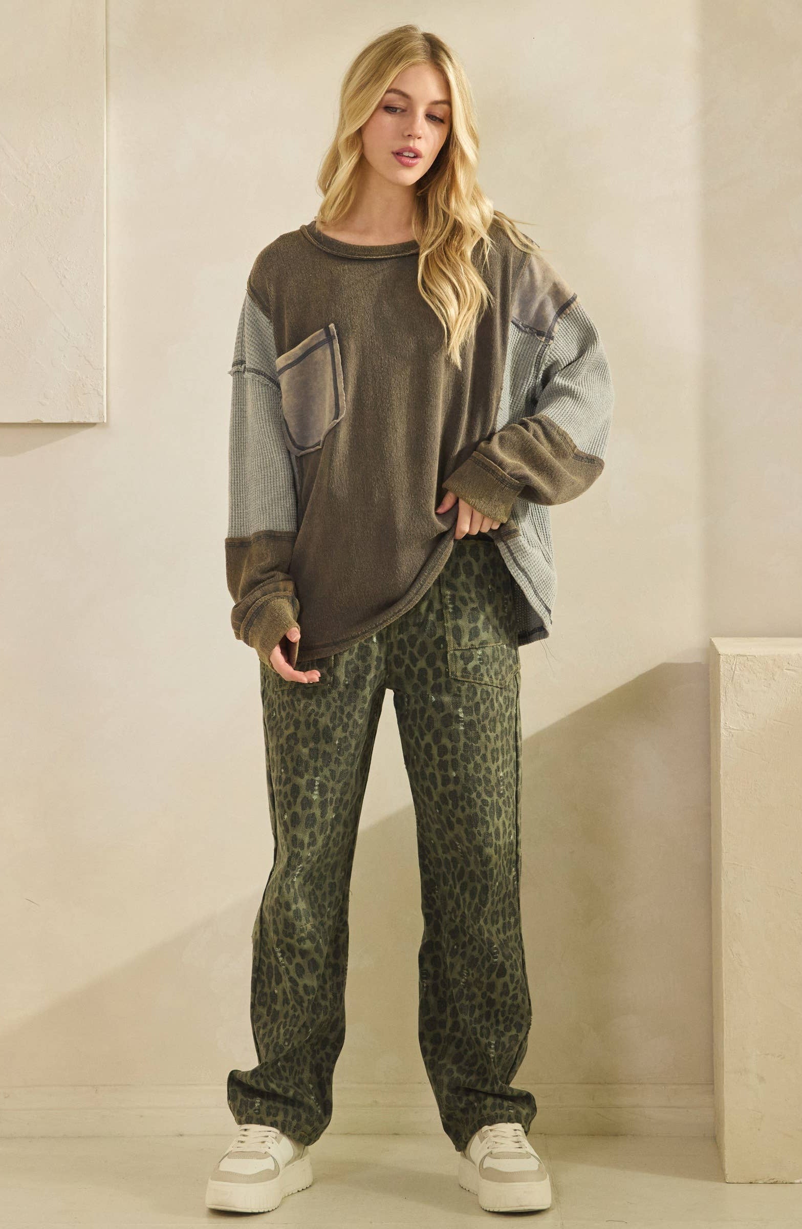 - MIXED FABRIC PANELS: WAFFLE KNIT, WASHED COTTON, AND TWILL