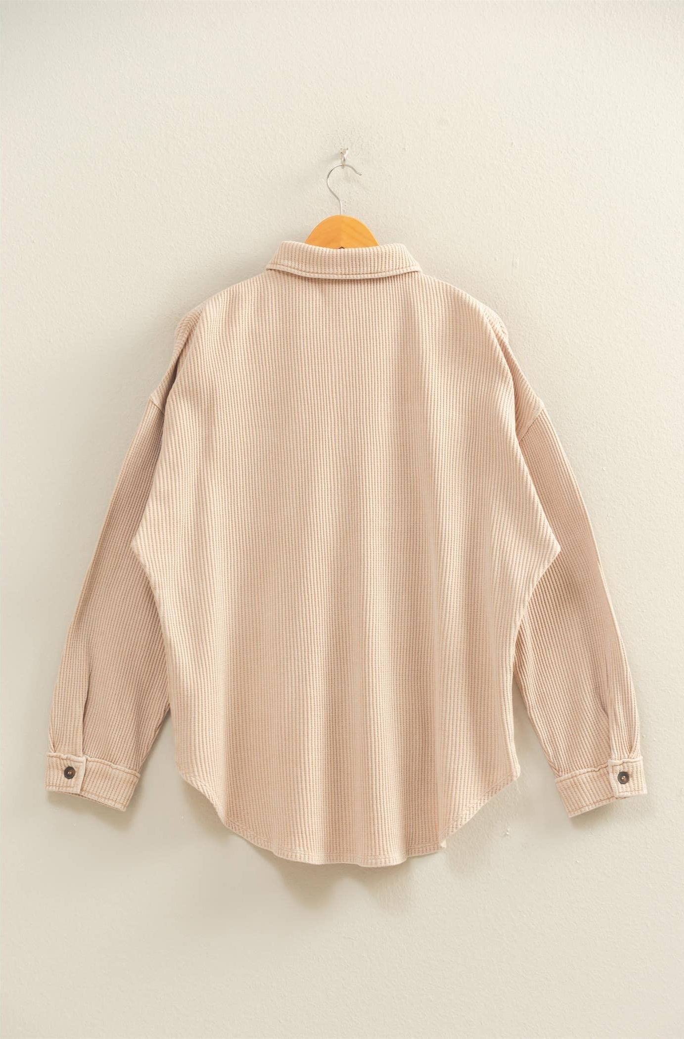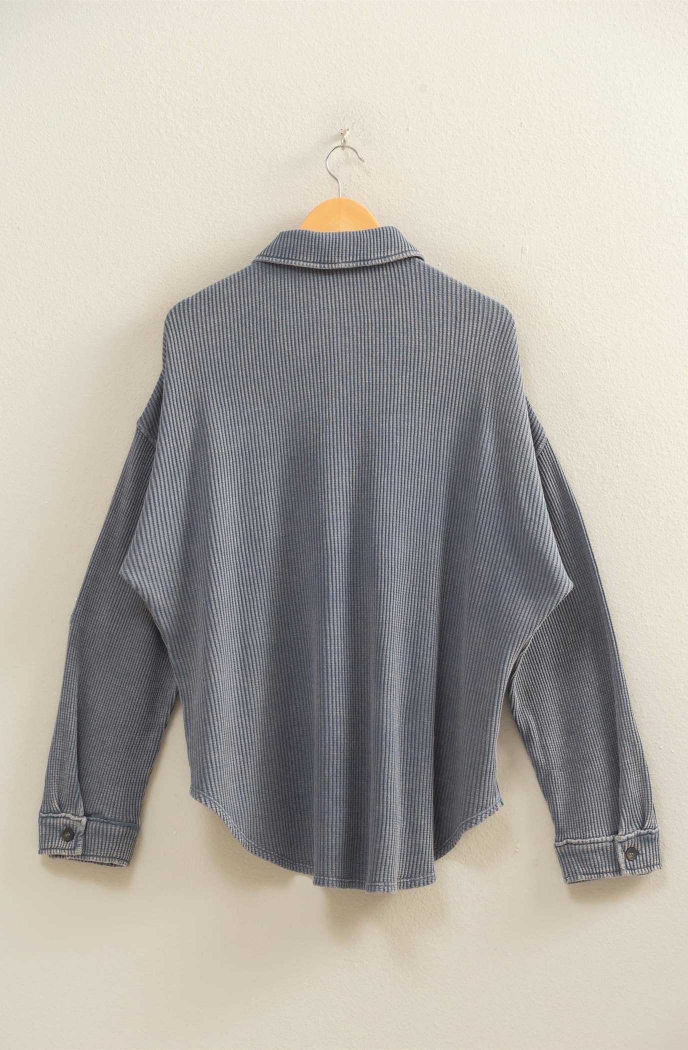 This mineral-washed oversized waffle knit shacket brings a trendy, laid-back vibe with its roomy fit. The oversized design makes it perfect for easy layering, whether you're heading out or keeping it casual. Style over a tee with jeans for an effortlessly cool look. 100% COTTON Imported. Designed In The USA