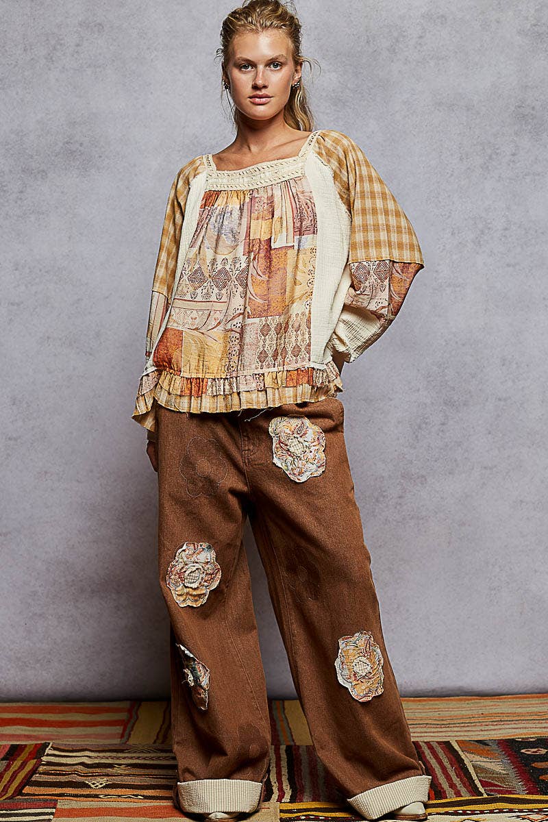 Designed in square neck, balloon sleeve, oversized fit top in double gauze with plaid contrast.