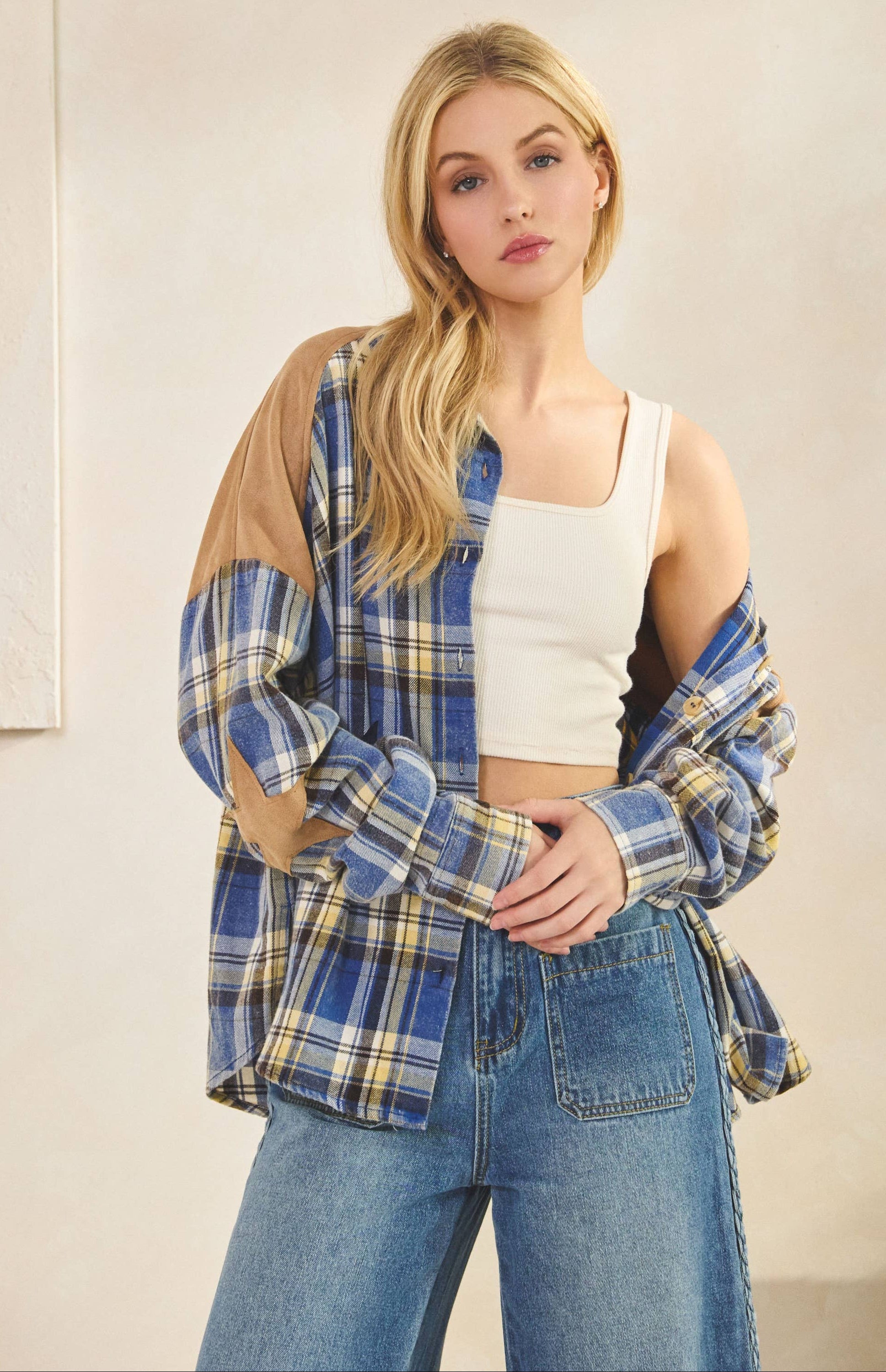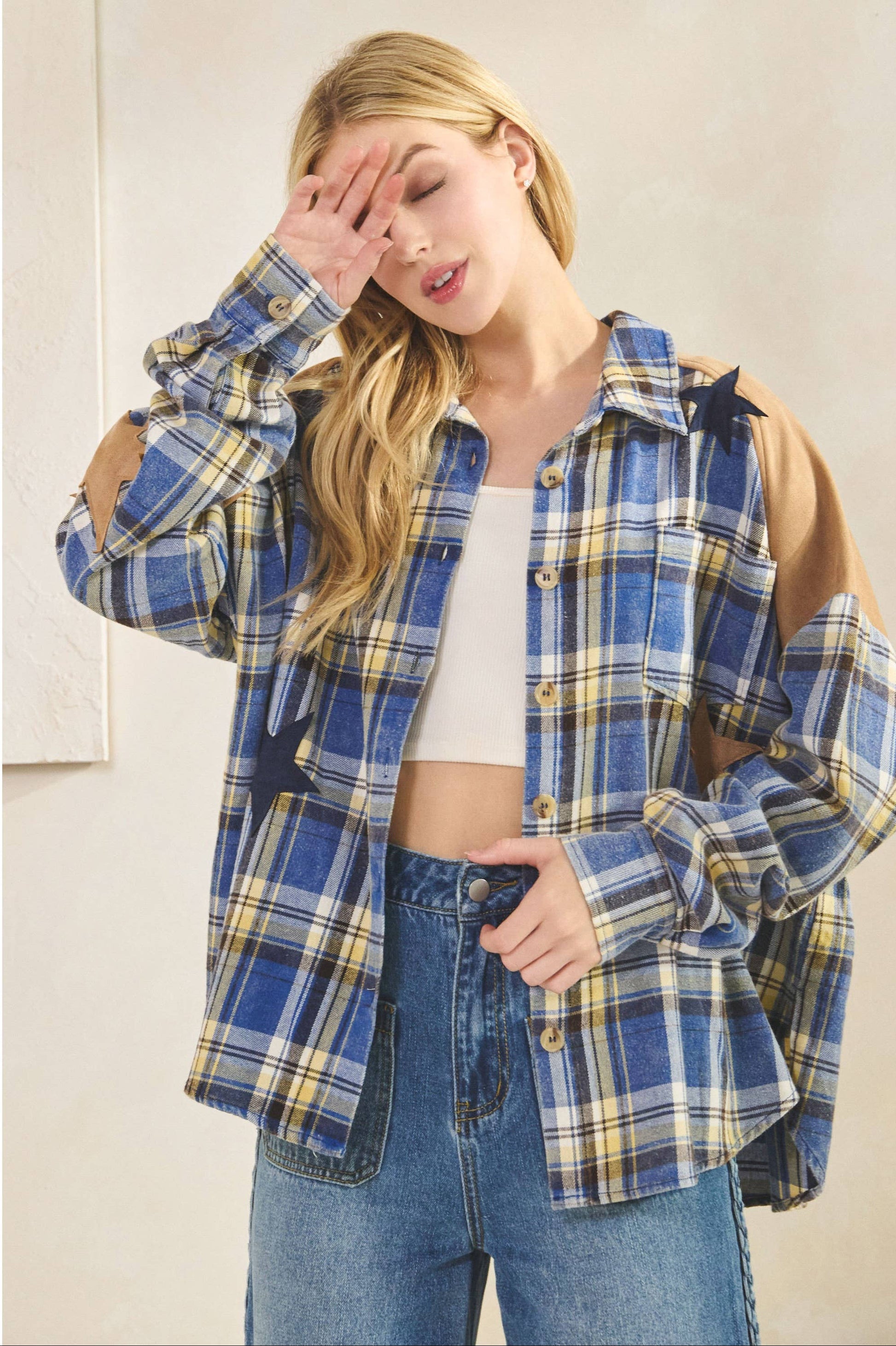 This oversized flannel shirt features a classic plaid pattern,plus playful star appliques scattered throughout with suede-like color-blocked panels at the shoulders and elbows, it brings just the right amount of western-inspired flair.